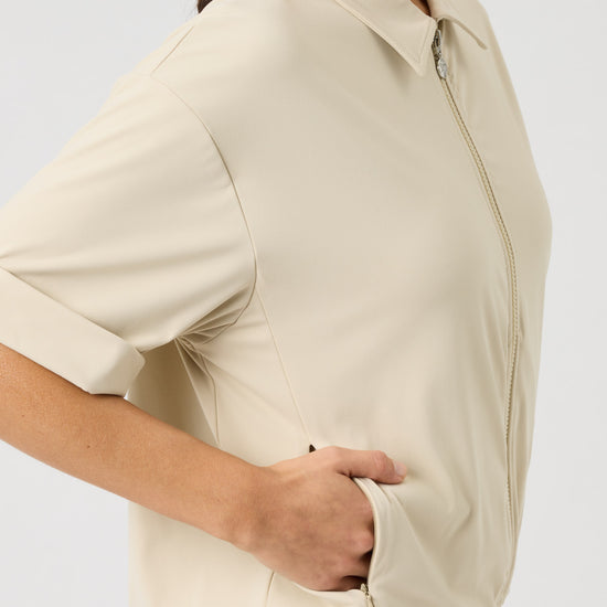 This drop-shoulder short-sleeved is made from soft, heavy interlock fabric for a structured yet comfortable feel. With short sleeves, an elastic hem, and front pockets, it combines sporty ease with everyday versatility.