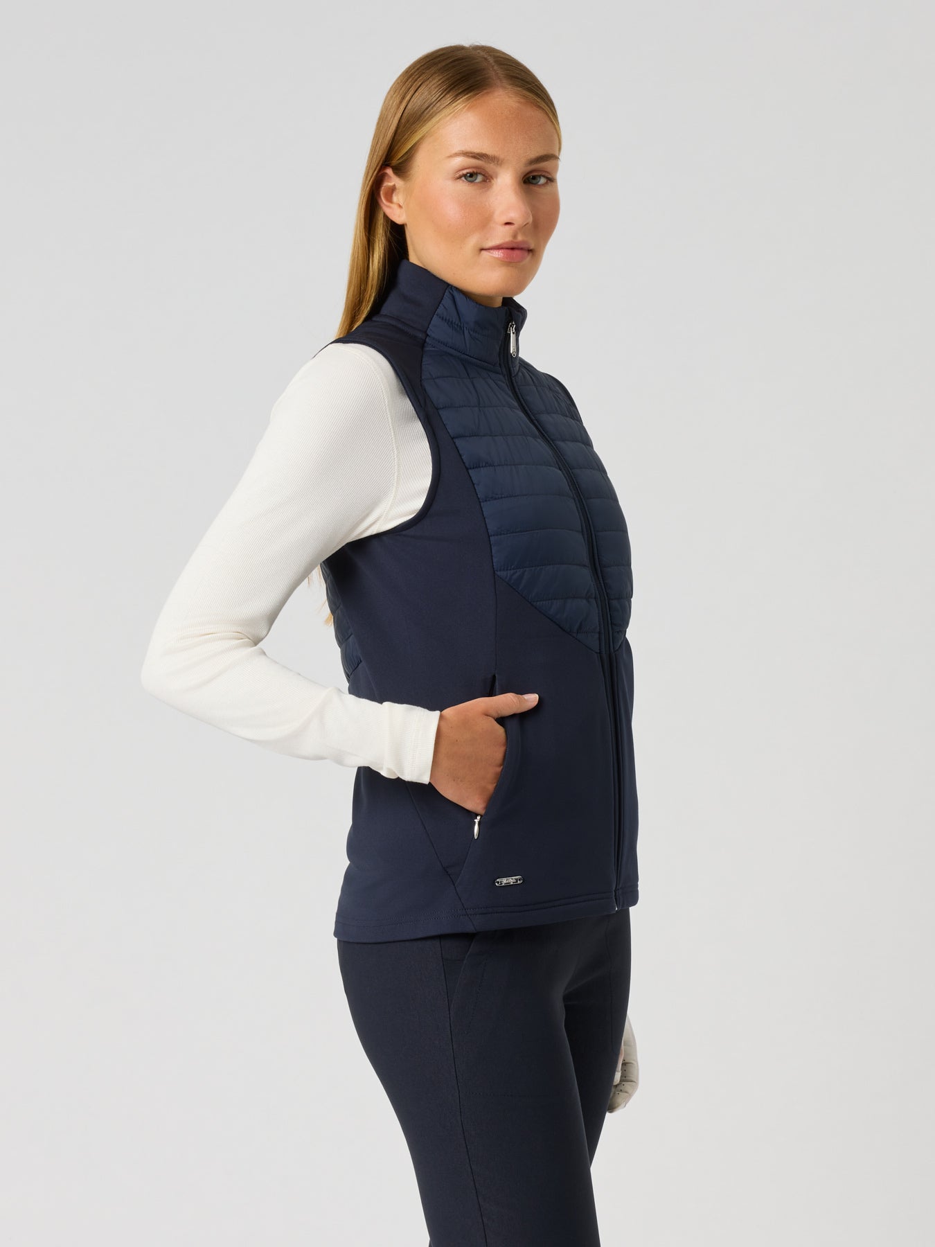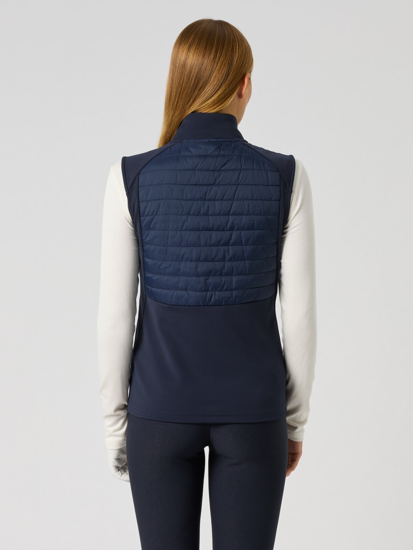 The Allos Hybrid Vest is designed for adaptability, combining quick-dry stretch micro-light jersey with quilted wind-resistant panels for targeted protection. This breathable, lightweight vest offers full range of motion, making it a functional layering piece for changing conditions on and off the course.