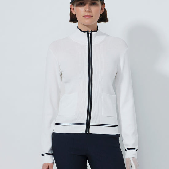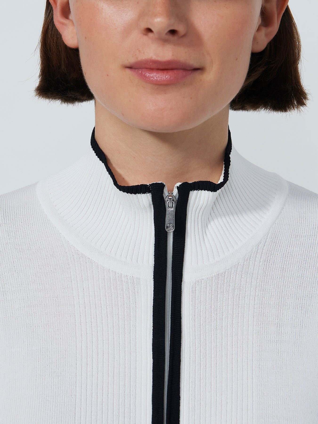 A long-sleeved cardigan in plain knit, detailed with contrast stripes at the cuffs and hem. The full zip front and two front pockets add function, while the viscose blend delivers softness and a premium drape.