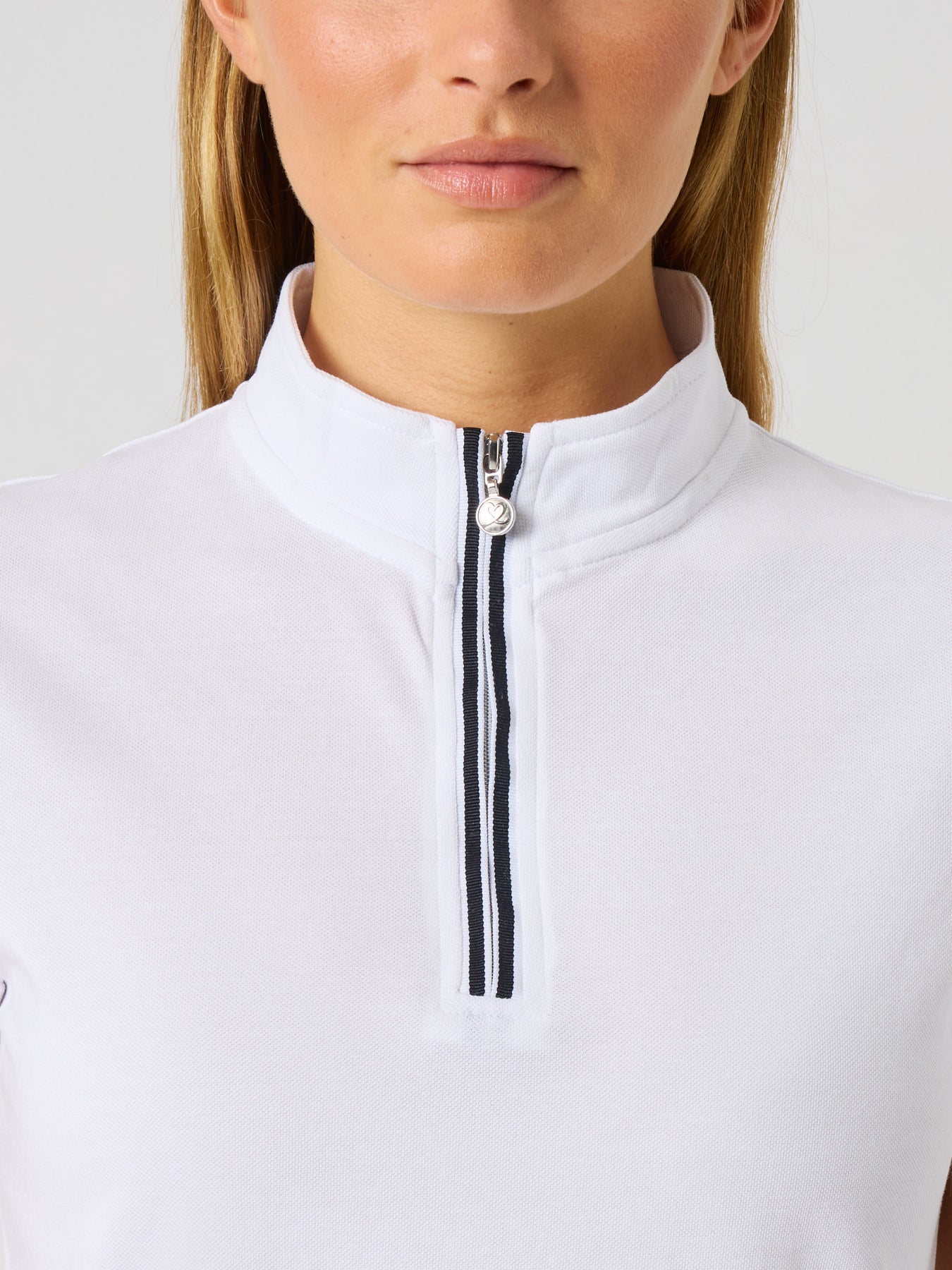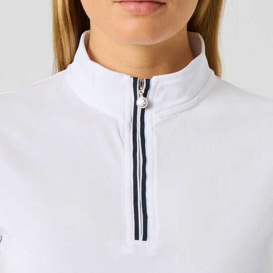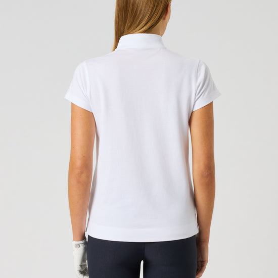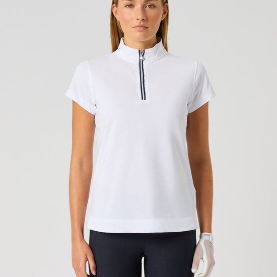 Kim is a short-sleeved top with a stand-up collar and zip, giving it a sporty look. The stretch fabric provides a flexible fit, as well as being moisture-wicking and quick-dry. A sporty and stylish golf top.