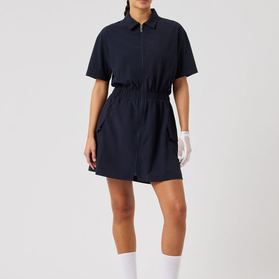 A lightweight dress in technical, stretchy wind fabric that combines comfort with functional design. The dropped shoulders and elasticated waist create a relaxed, feminine silhouette, while the full front zip and patch pockets add a sporty touch. Finished with subtle Daily embroidery at the pocket.