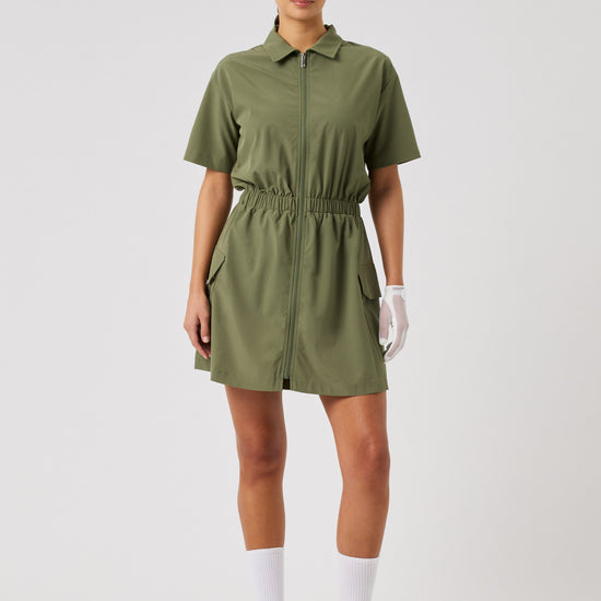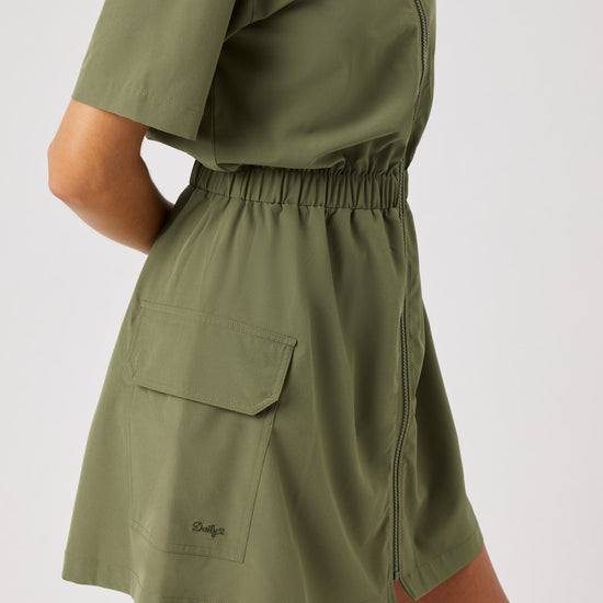 A lightweight dress in technical, stretchy wind fabric that combines comfort with functional design. The dropped shoulders and elasticated waist create a relaxed, feminine silhouette, while the full front zip and patch pockets add a sporty touch. Finished with subtle Daily embroidery at the pocket.