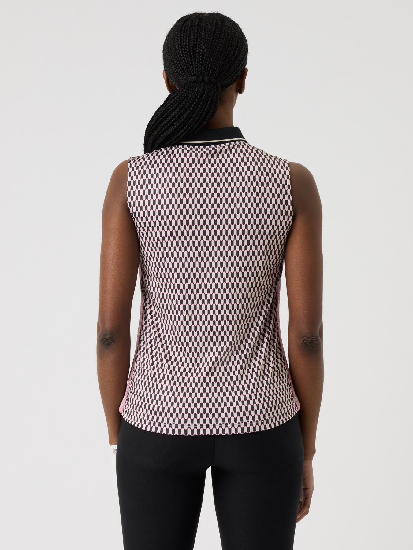 A soft, stretchy sleeveless top with an all-over print that combines comfort with a touch of shine. Made from quick-drying, moisture-wicking fabric to keep you cool and dry. The striped knitted collar and logo buttons give it a sporty, polished look, while the multicolour lurex tape along the sides adds a subtle, feminine sparkle.