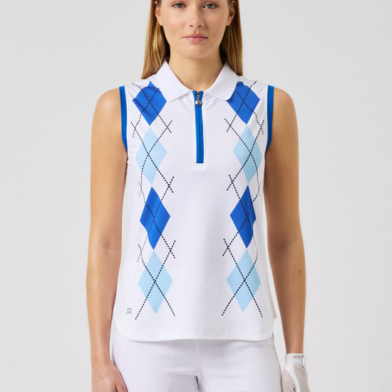 A sleeveless top with a soft, stretchy feel and a refined argyle placement print at the front. The quick-drying, moisture-wicking fabric keeps you cool and comfortable during active days. Designed with a ribbed collar and a half zip for a sporty touch, while the rounded hem with side slits and smooth binding around the armholes create a clean, flattering silhouette.