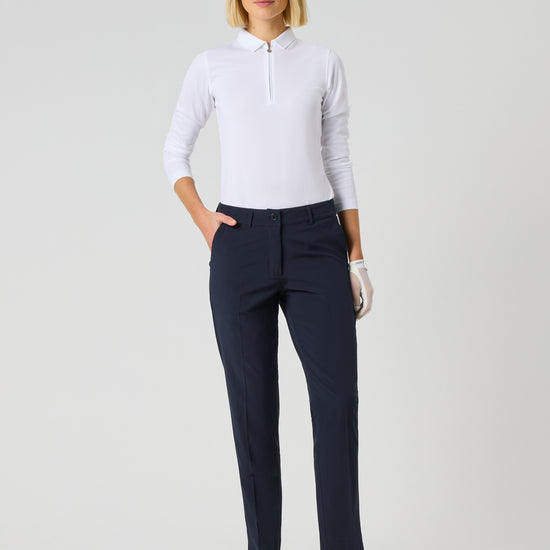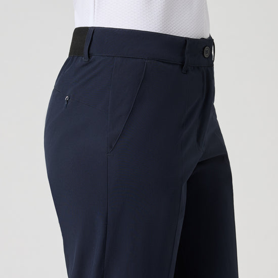 Beyond are flattering ankle-length pants with a straight fit. They provide a dressy look with a crease, a fly, two front side pockets and one rear pocket with zip. They are stretch fabric with an elasticated rear waistband. The lightweight fabric is made from recycled polyester and is wind-resistant, quick-dry and stays wrinkle-free.