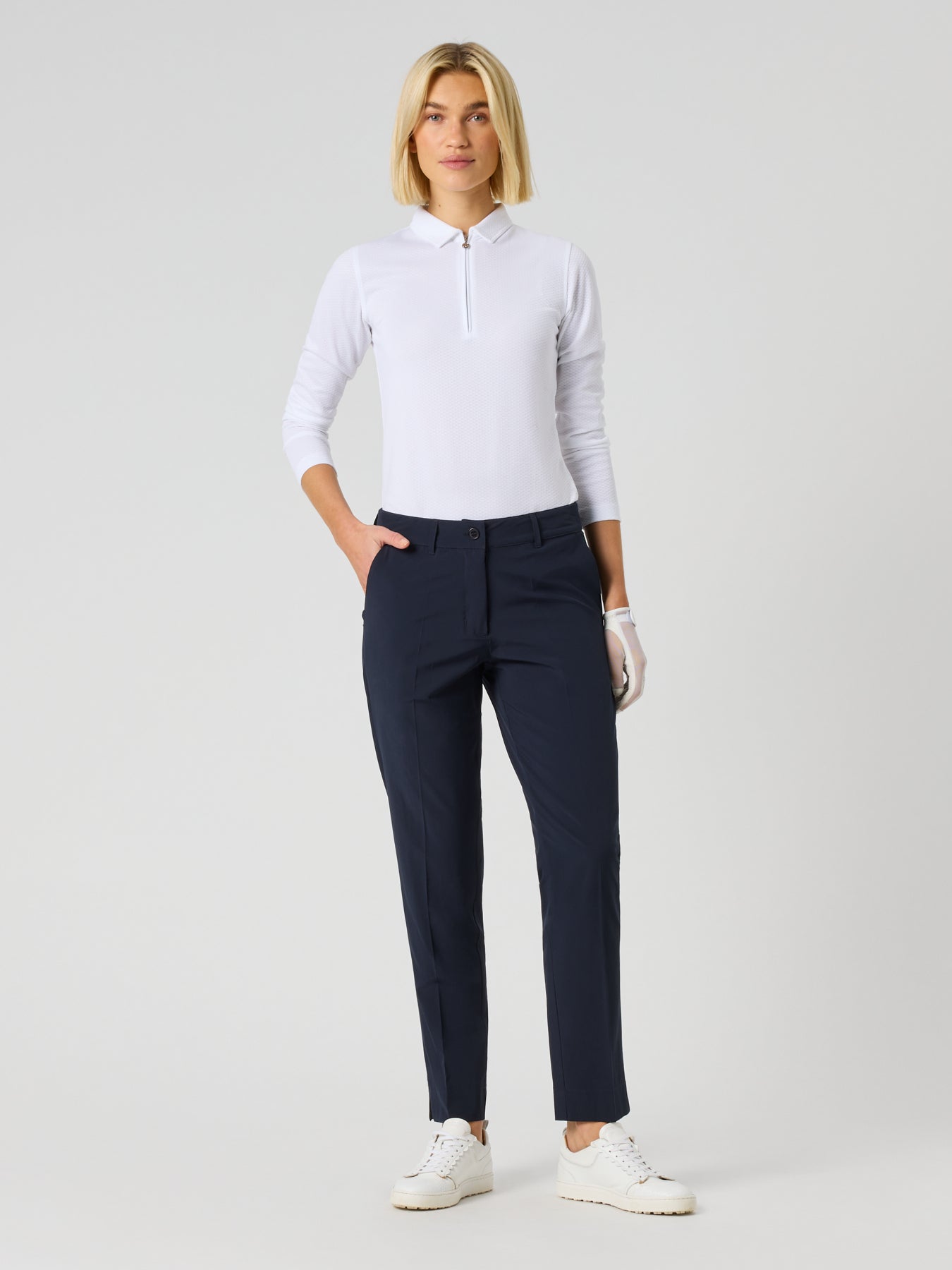 Classic and versatile, the Beyond Ankle Pants are a must-have for any modern golfer. Made from eco-conscious recycled polyester, they are tailored with a pressed crease for a polished look. The button-fly closure and slant pockets enhance practicality, making these pants an great choice for the golf course or everyday sophistication.