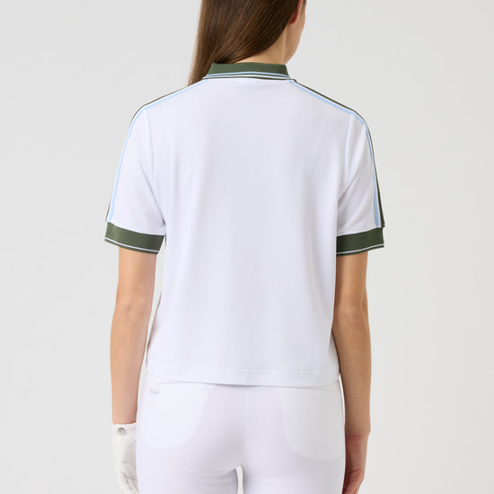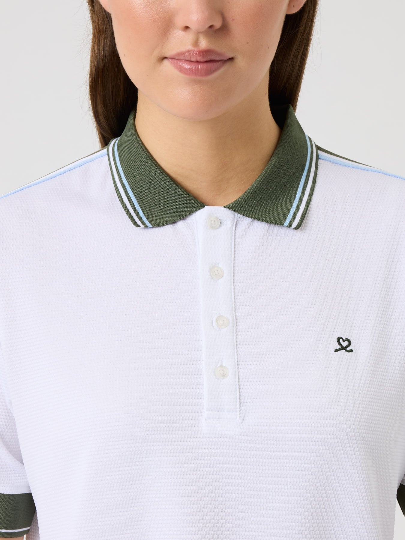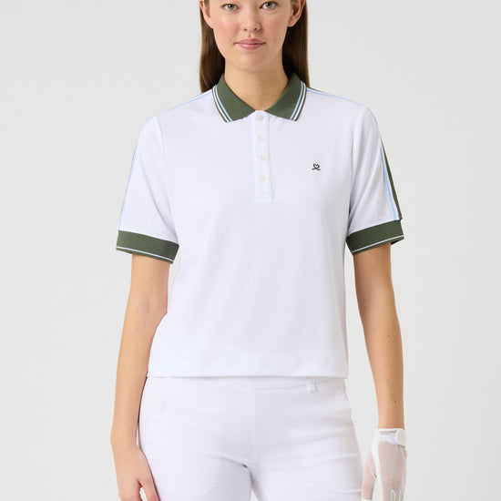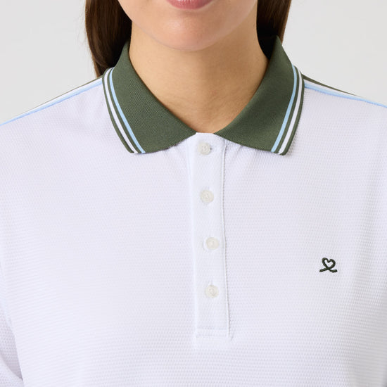 A soft, stretchy polo shirt in textured dobby jersey with a relaxed fit and dropped shoulders for a comfortable silhouette. The quick-drying fabric keeps you cool and dry, while the contrasting knitted collar, striped ribbon along the sleeves, and matching cuffs add a sporty, refined touch. Finished with logo buttons and subtle logo embroidery at the chest.