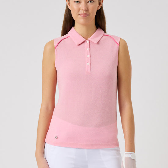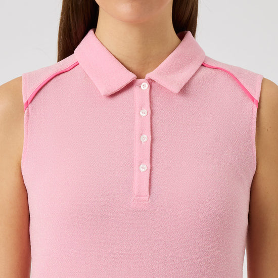 Soft single jersey with a subtle lurex shimmer gives this sleeveless polo a refined, feminine feel. The quick-drying, moisture-wicking fabric keeps you cool and comfortable throughout the day. Designed with piping along the shoulder yoke for a clean, sporty look and finished with logo buttons at the front.