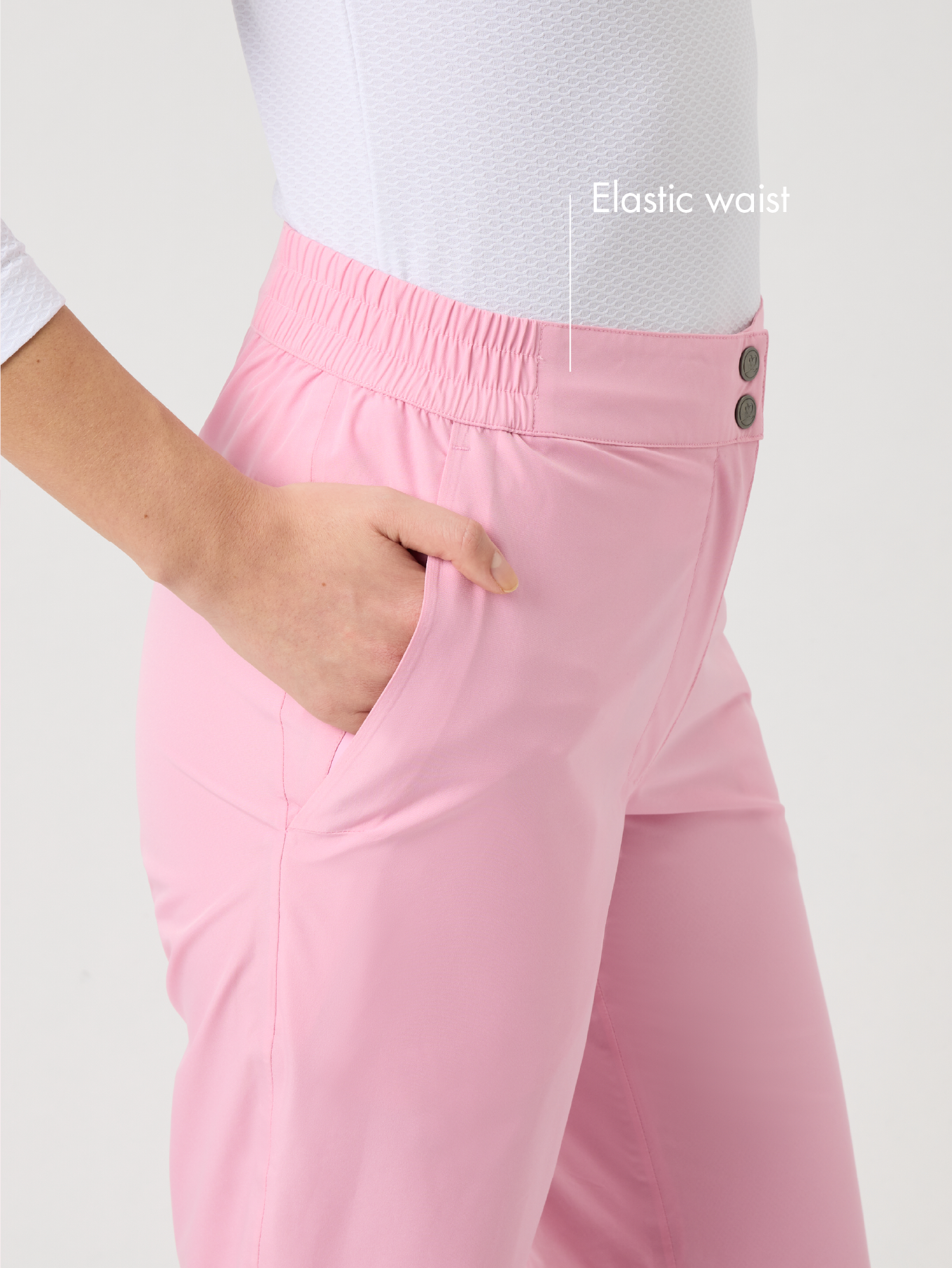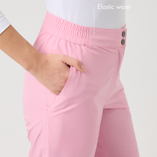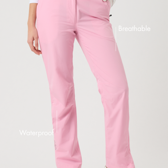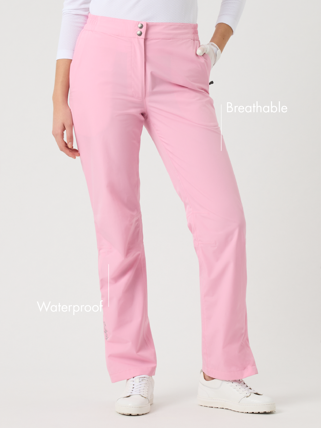 Flaine is a pair of stylish rain trousers with a flexible fit in technical stretch. The trousers have two front zip pockets and a snug fit with spacious legs and Velcro at the hem. The material is water repellent and breathable. The trousers have a soft lining and taped seams to keep moisture out.