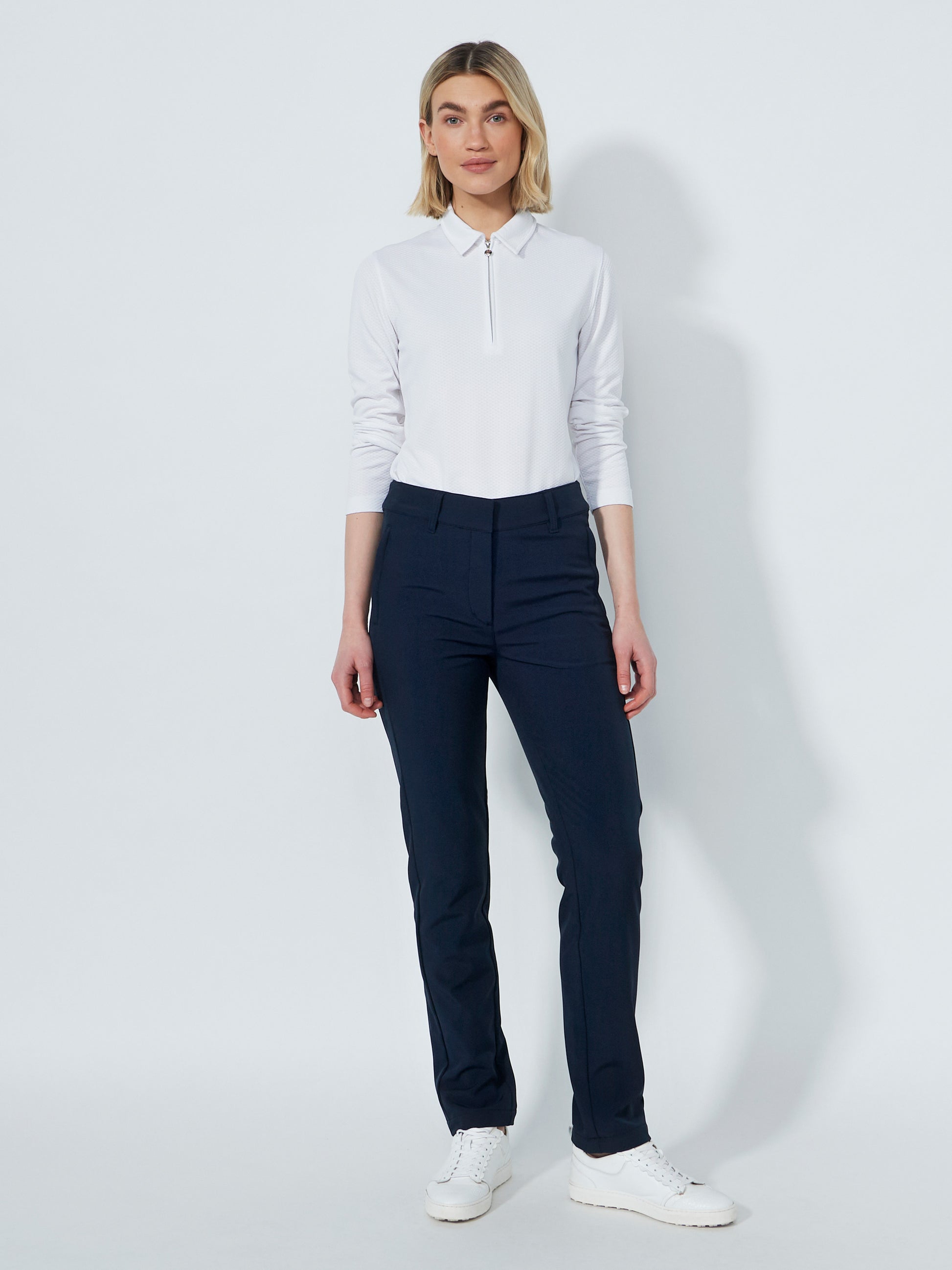 A regular-fit pant with soft peached lining, stretch comfort, and a feminine silhouette. Wind- and water-resistant, it features multiple zip pockets and wrinkle-resistant ease for everyday wear.