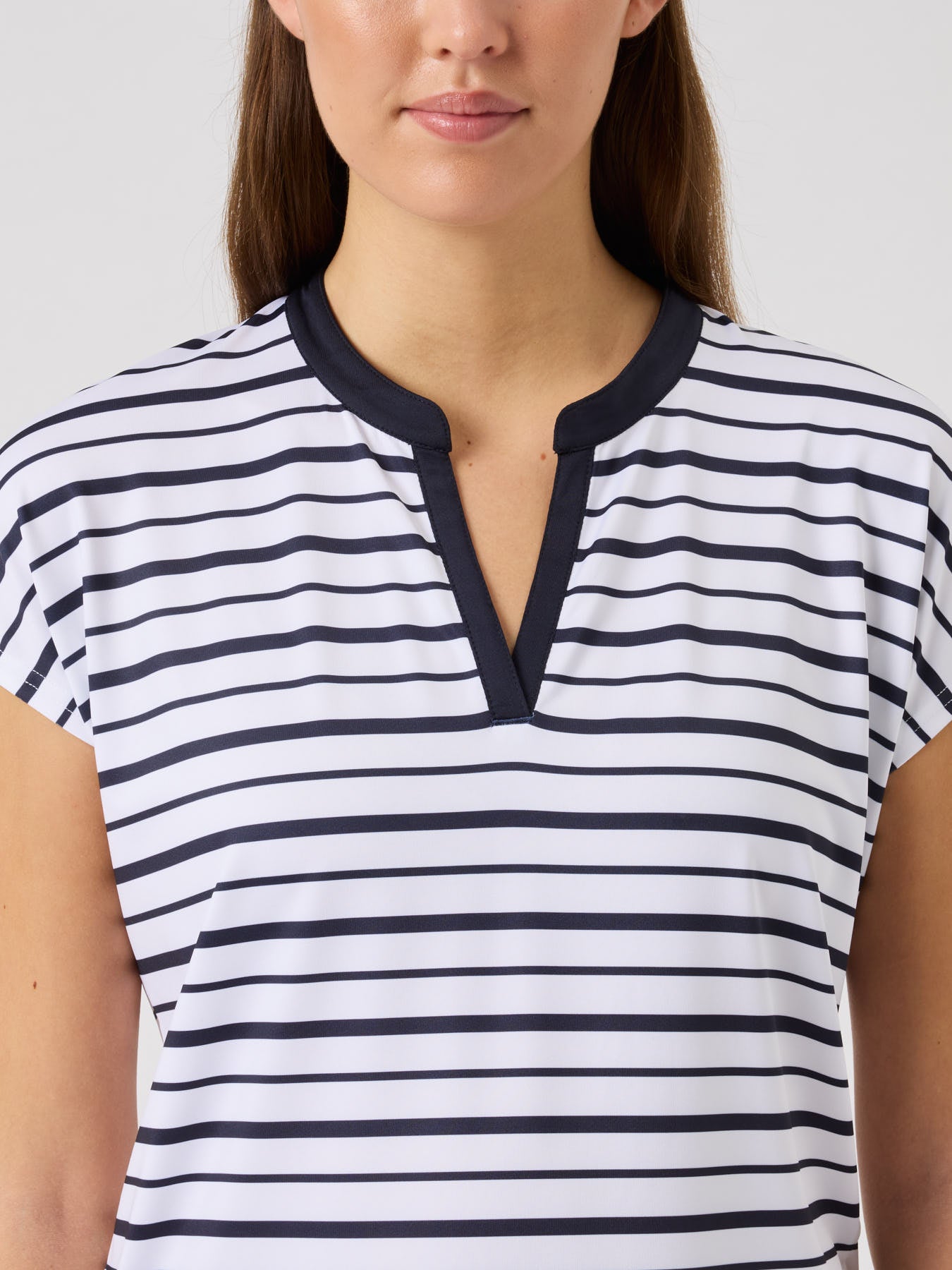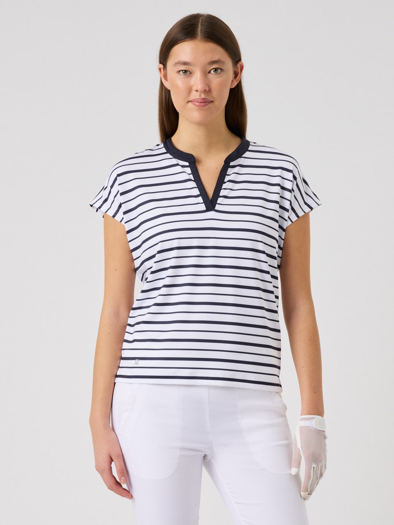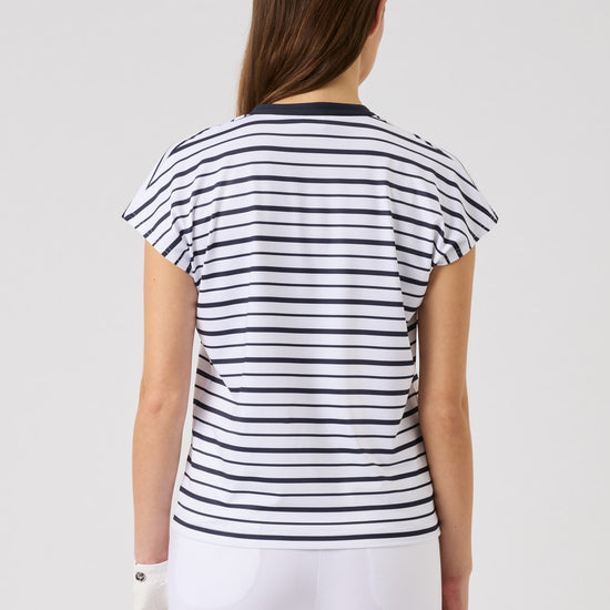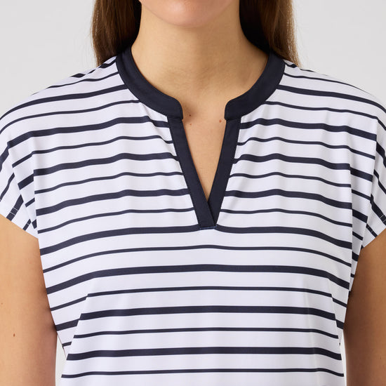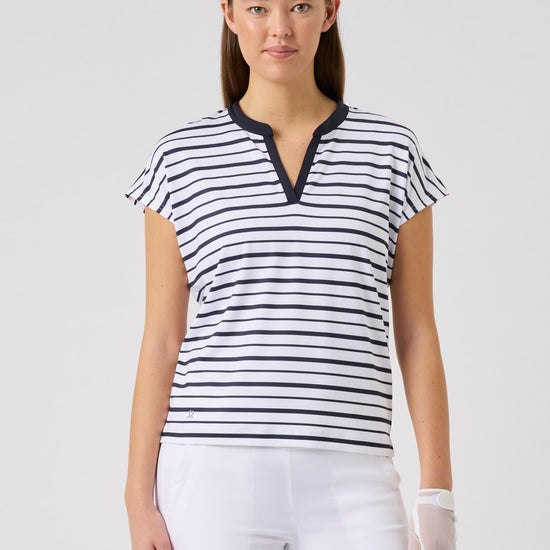 The Itami short-sleeved top combines a clean, modern look with functional comfort. Made from soft, stretchy fabric with quick-drying, moisture-wicking properties, it keeps you comfortable in every movement. The subtle striped print and solid trim at the neckline add a refined touch, while the relaxed fit creates an effortless, versatile style for on and off the course.
