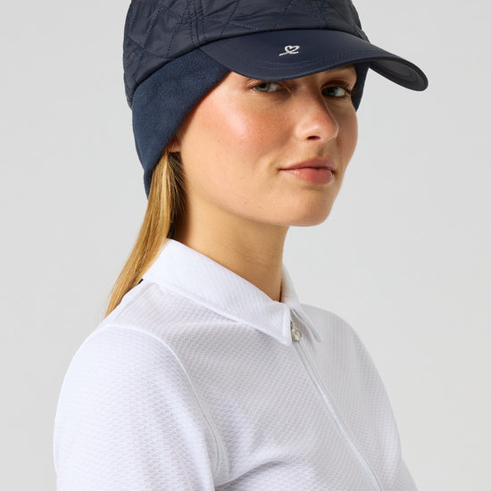 The Jolie wind cap is a lined golf cap with an attractive and practical design. The quilted, wind and water-repellant fabric features checked stitching. The fleece lining and fold-up earflaps protect against wind and weather, and the size is adjustable with velcro at the back.