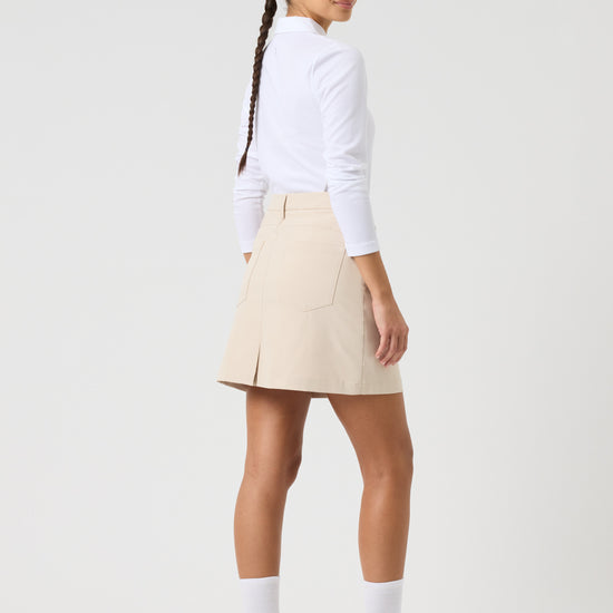 The Lyric V2 skort is a 45 cm skirt featuring comfortable inner shorts, front and back pockets, a small back slit, and an elastic waistband. Made from stretchy fabric that repels wind and water, it stays wrinkle-free and ensures all-day comfort.