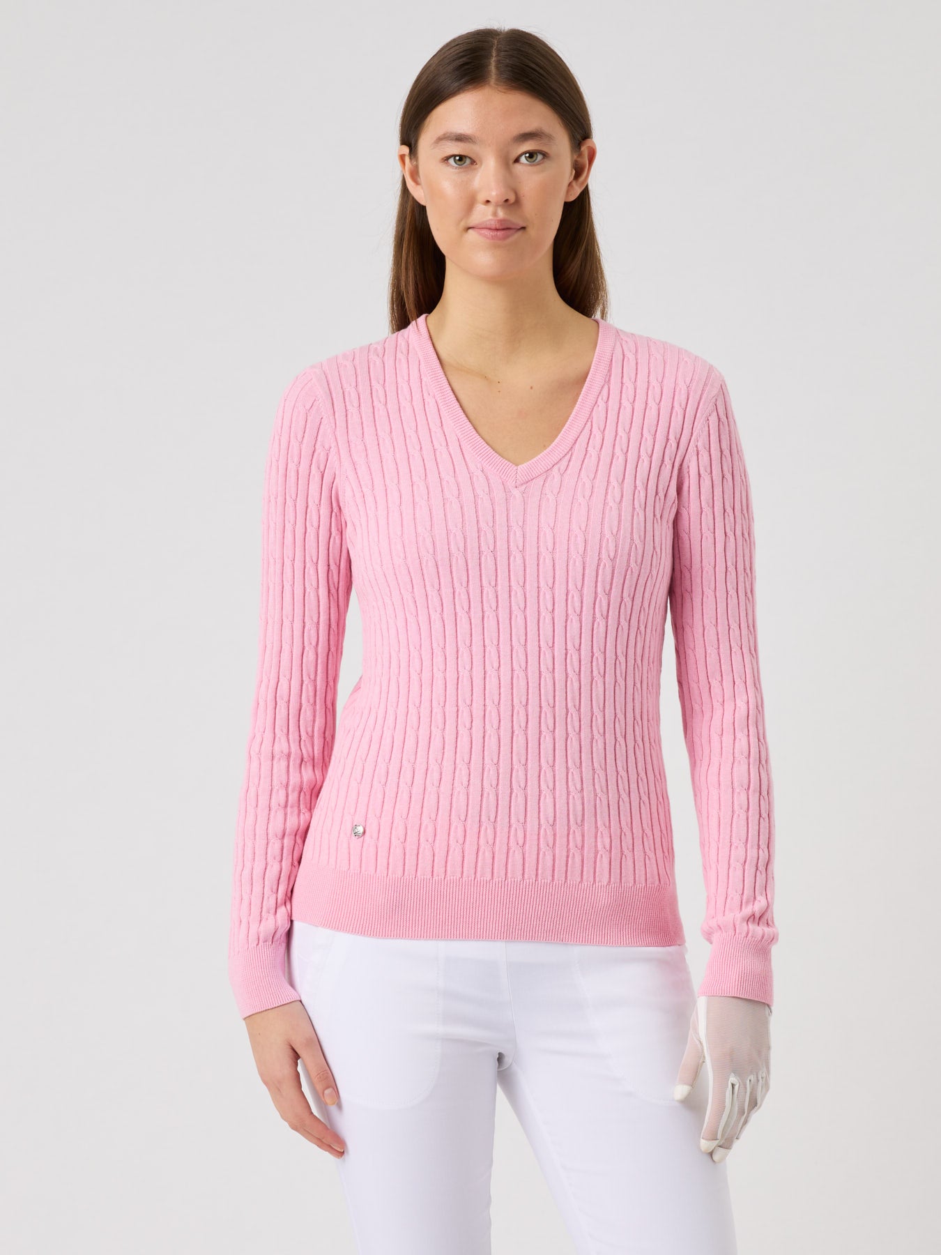 The Madelene Pullover is an exclusive golf jumper with a classic cable knit, V-neck and cuffs. The jumper is made from a soft cotton material with a 5% cashmere. A timeless piece that works just as well on the golf course as in everyday life.