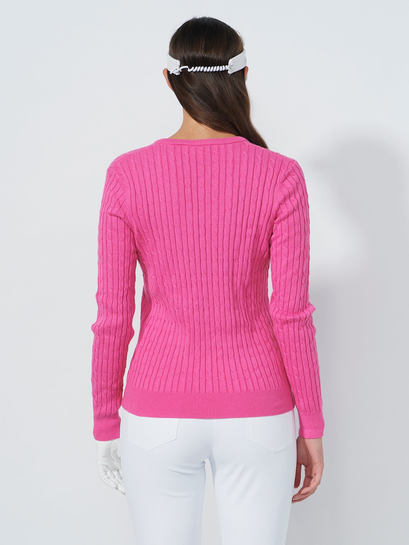 The Madelene Pullover is an exclusive golf jumper with a classic cable knit, V-neck and cuffs. The jumper is made from a soft cotton material with a 5% cashmere. A timeless piece that works just as well on the golf course as in everyday life.