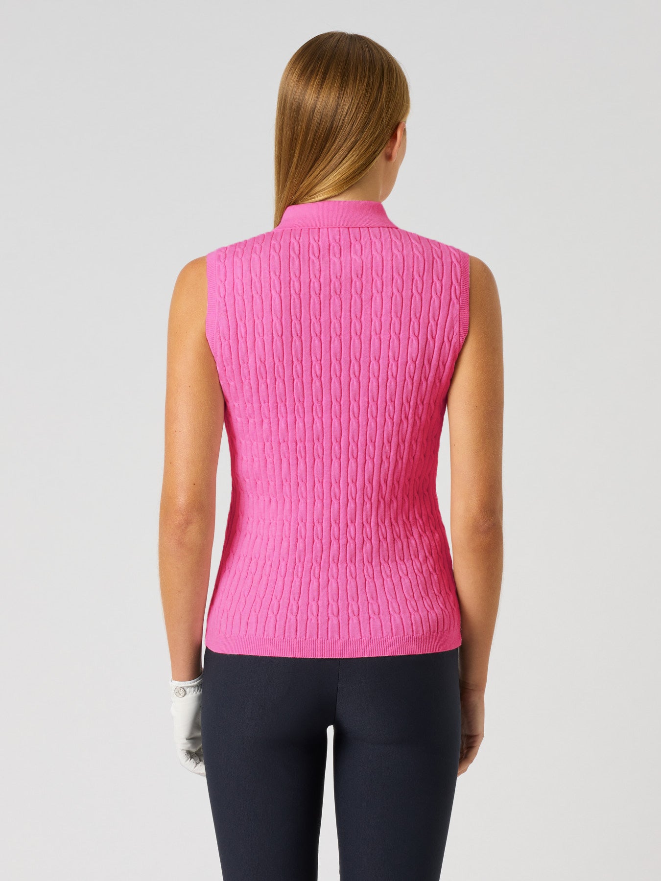 The Madelene sleeveless top is crafted from a cotton and cashmere blend for breathability and softness. Featuring a cable knit design and a flat knitted collar, it provides comfort and flexibility, making it a functional choice both on and off the course.