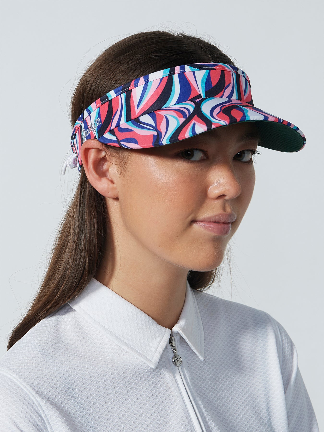 Print Visor with black and turquoise print of geometric shapes shades the face and keeps hair in place. The underside of the visor is green for anti-glare and the soft terry cloth interior traps sweat on the forehead. Adjust the size with the adjustable elasticated strap.