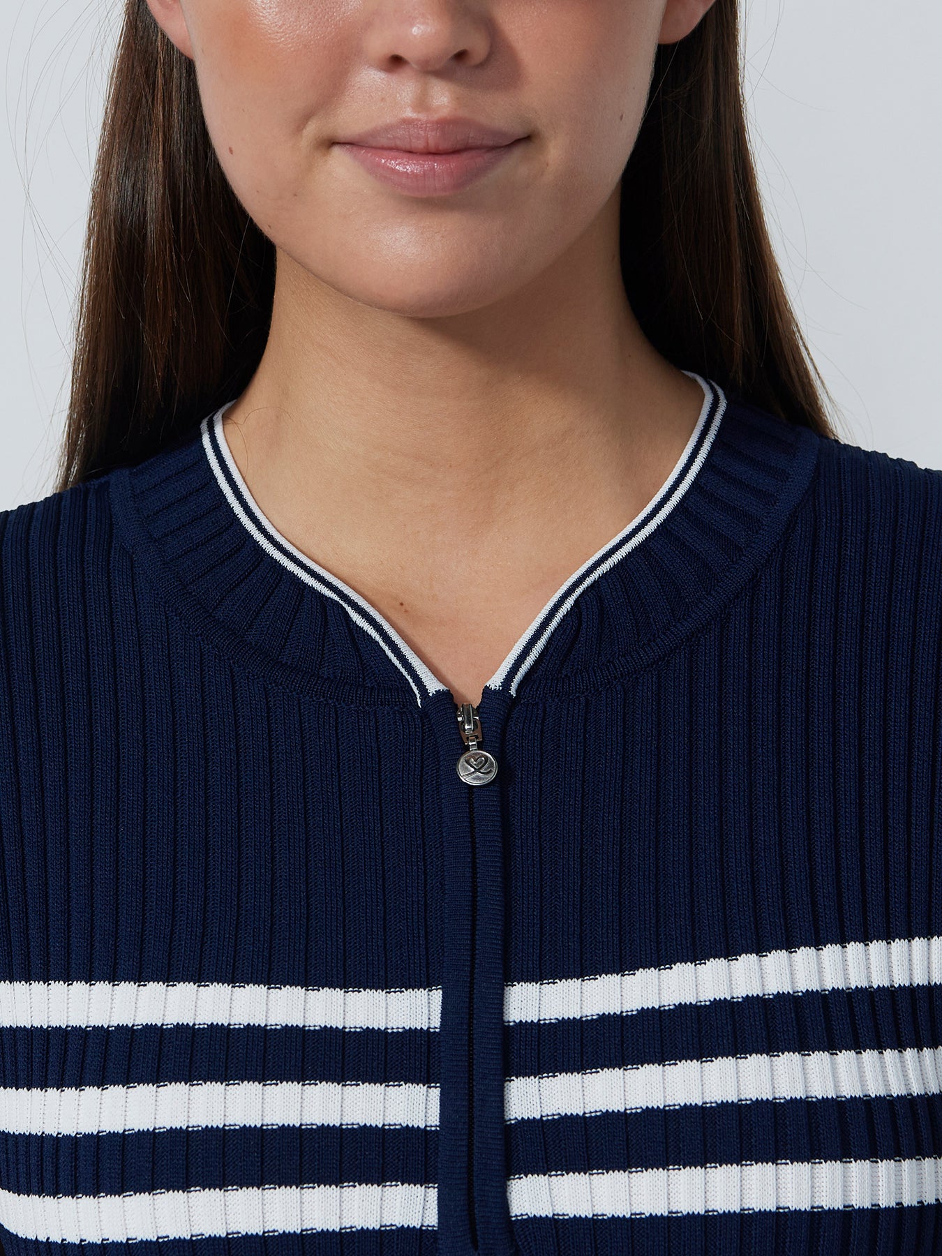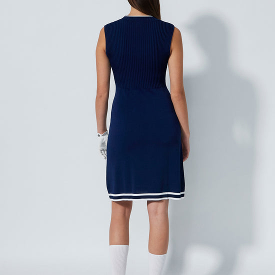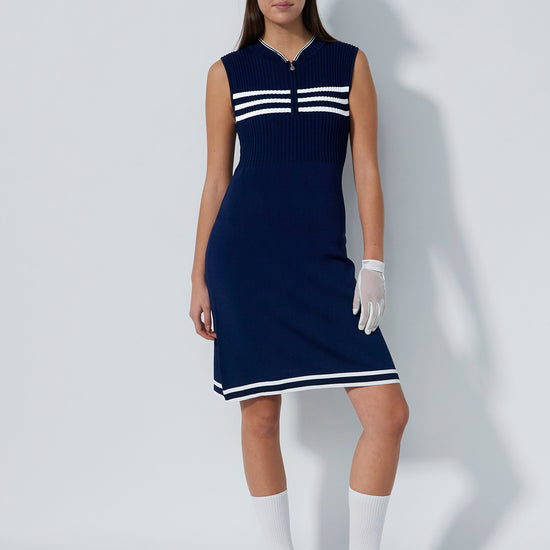 Designed for mobility and comfort, the Awara sleeveless golf dress is made from stretchy knitted fabric that allows for full range of motion. With ribbed detailing and contrast stripes, it offers a secure and flexible fit, making it a functional choice both on and off the course.