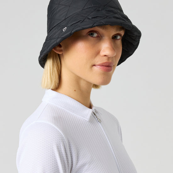 Catania is a bucket hat or fishing hat in quilted fabric. It is made from durable nylon fabric and has a gold embroidered Daily Sports heart on the front. A trendy accessory for the golf course or town.