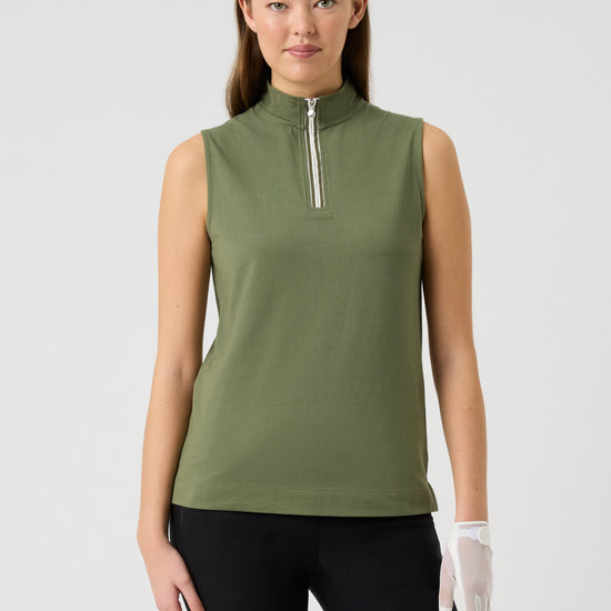 Designed for comfort and performance, the Kim sleeveless top features a stand-up collar and striped placket zip for adjustable ventilation. Made from stretchy pique fabric, it delivers moisture control and quick-dry properties, ensuring unrestricted movement on the course.