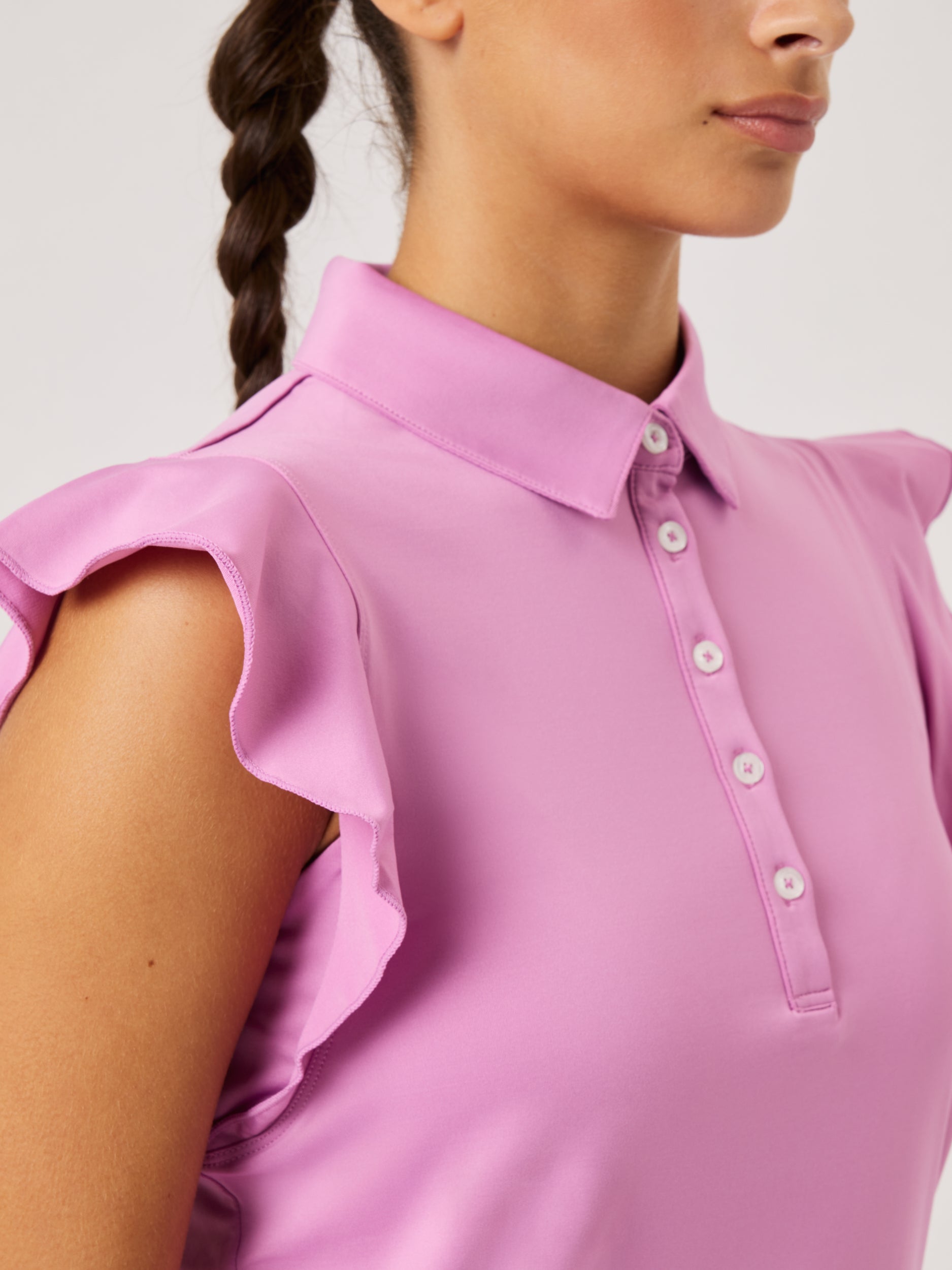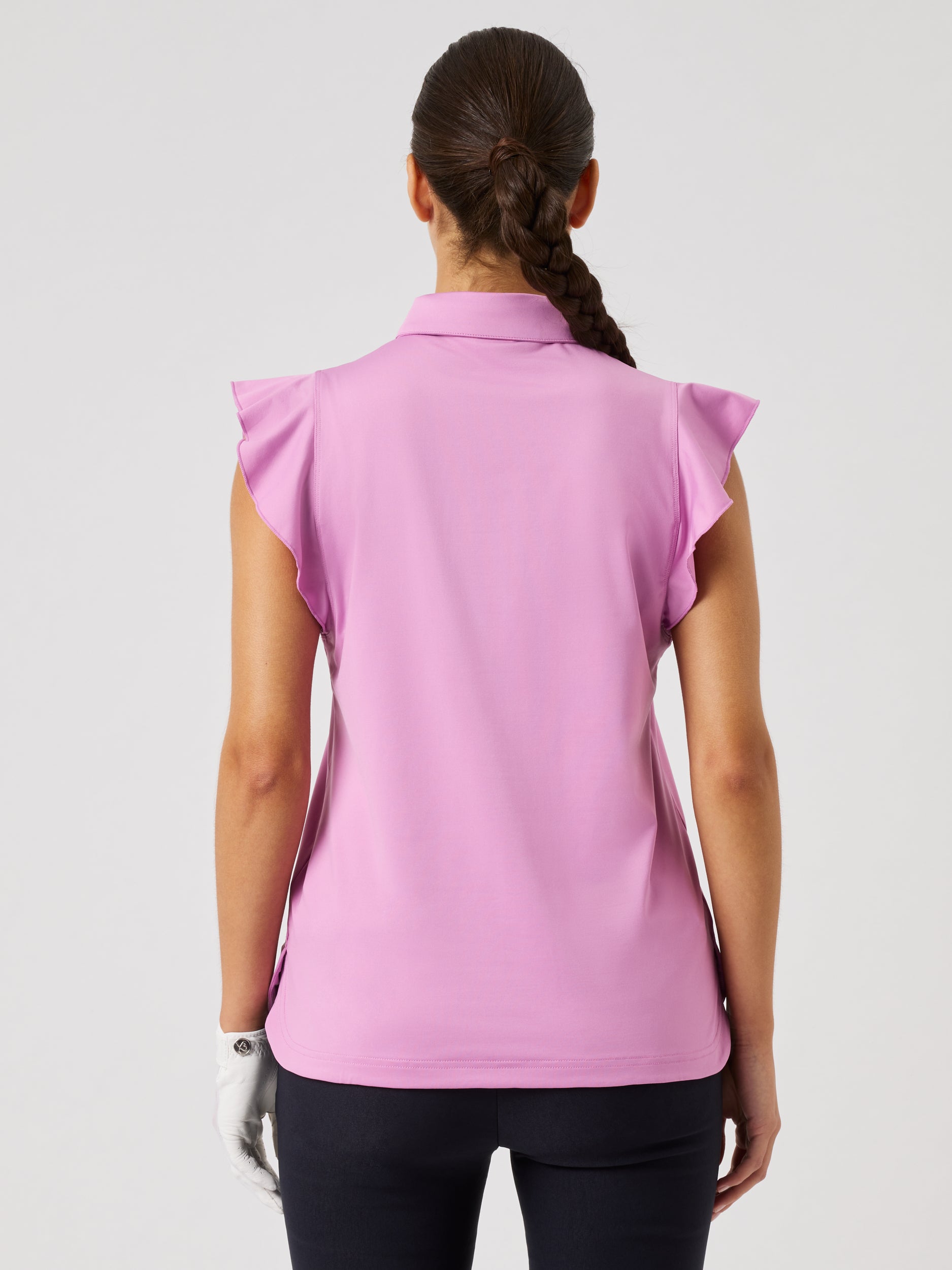 Designed for breathability and style, the Luxe sleeveless top features stretchy, quick-dry fabric for all-day comfort. The ruffled cap sleeves allow for unrestricted movement, making this lightweight, moisture-wicking polo a functional choice for golf or casual wear.