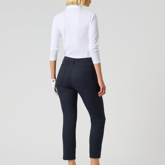 Lyric V2 pants feature an ankle-length design with a small decorative slit. They offer a tailored yet comfortable fit in stretchy fabric with an elastic waistband. The pants are wind- and water-repellent, dry quickly, and stay wrinkle-free.