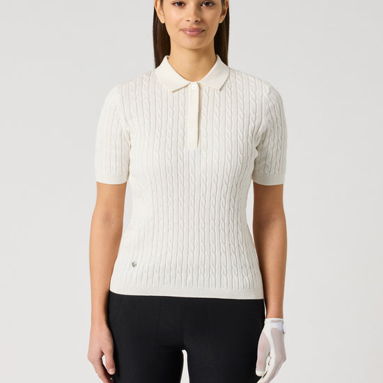 Madelene is a preppy cable knit polo shirt with short sleeves, a V-neck and hidden button placket. The shirt is cut in a slim fit and made from a soft cotton material with a hint of cashmere, adding an exclusive feel. A classic piece for all occasions.