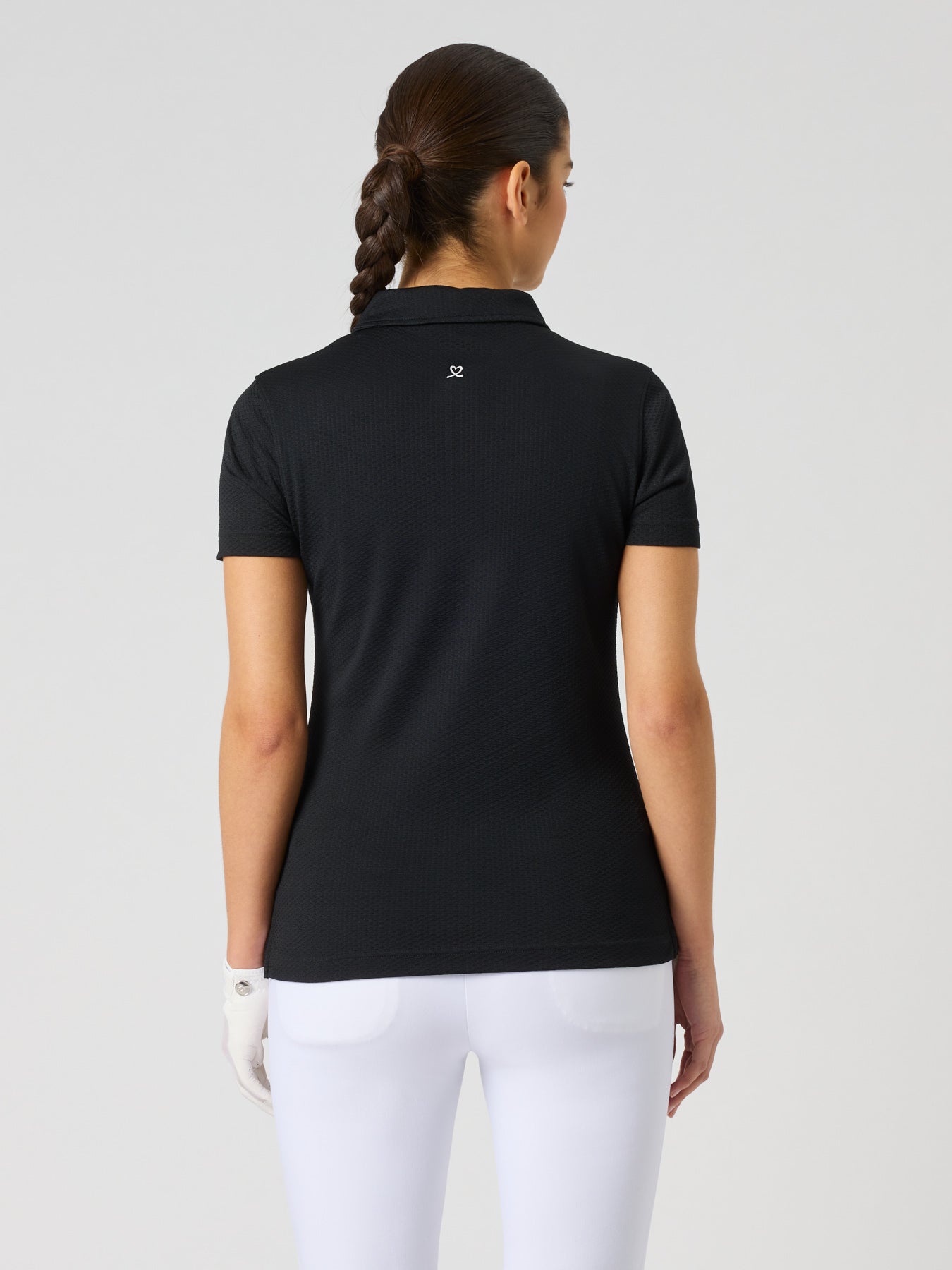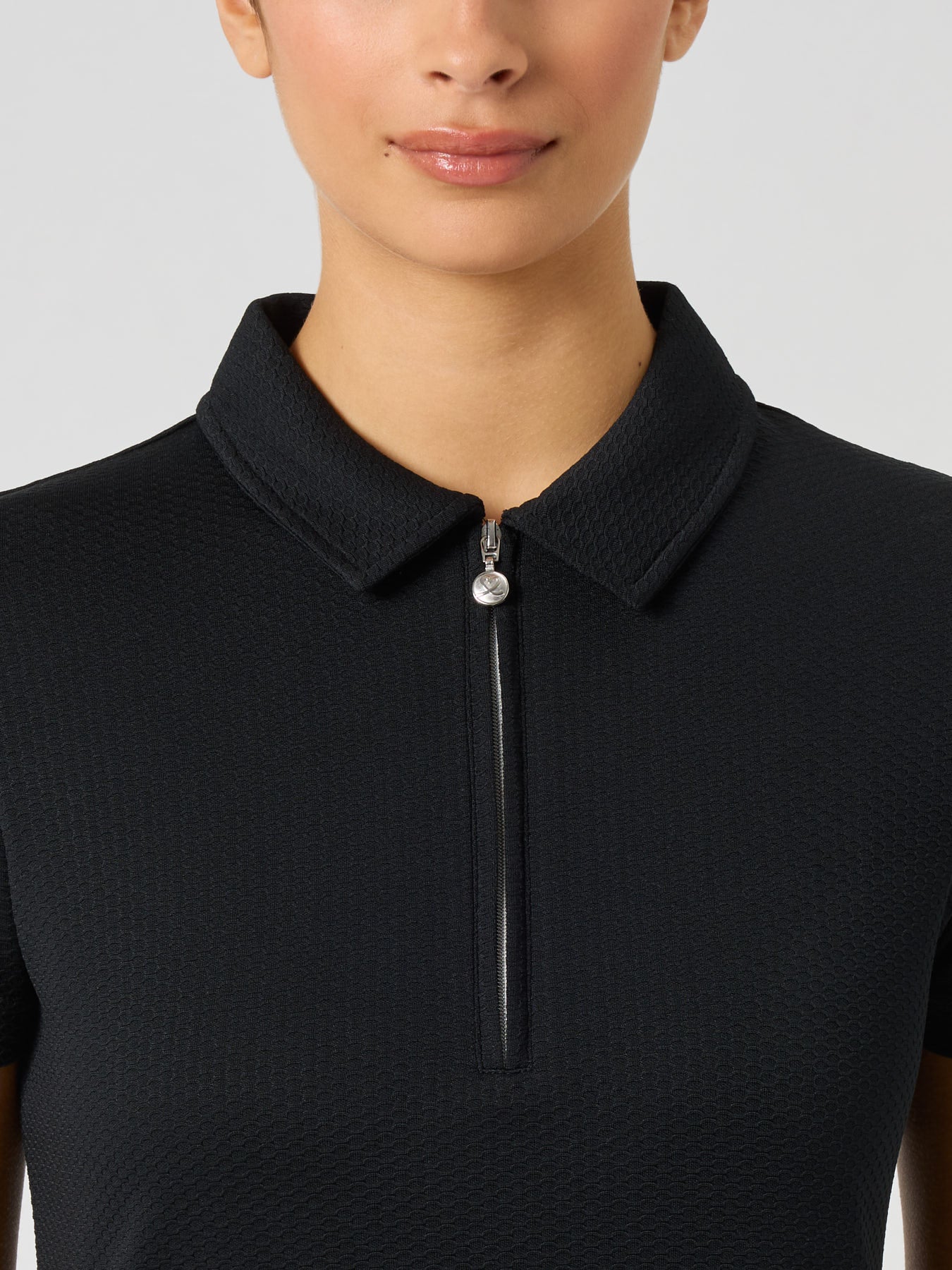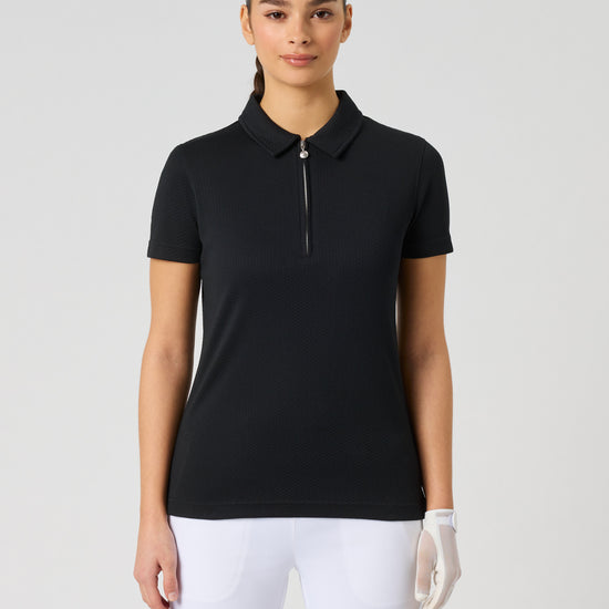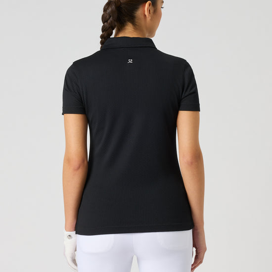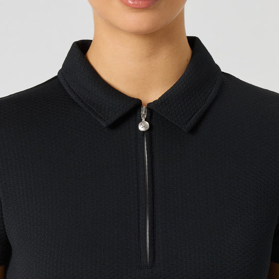 Peoria is a fitted golf polo shirt with a neat collar and short sleeves for a sophisticated look. The recycled jacquard knit material gives the top a sporty texture. The fabric also has functional properties that dissipate heat and dry up quickly.