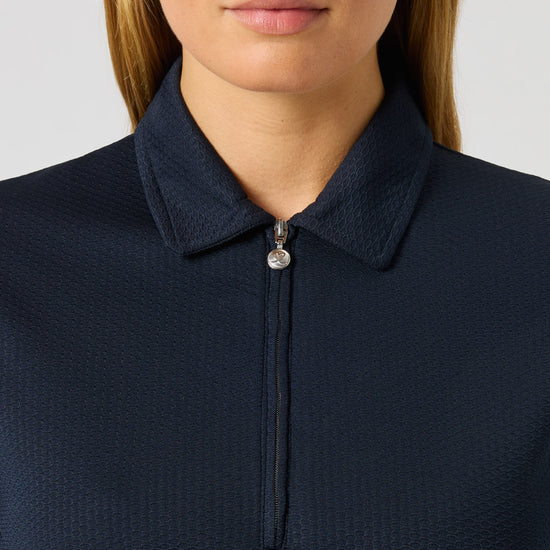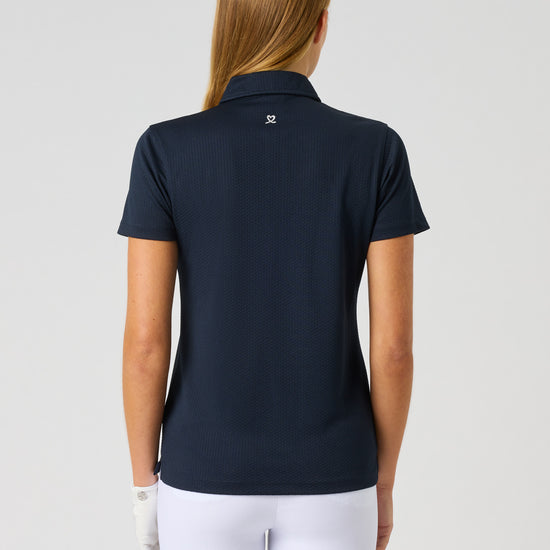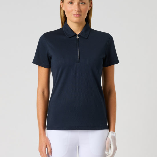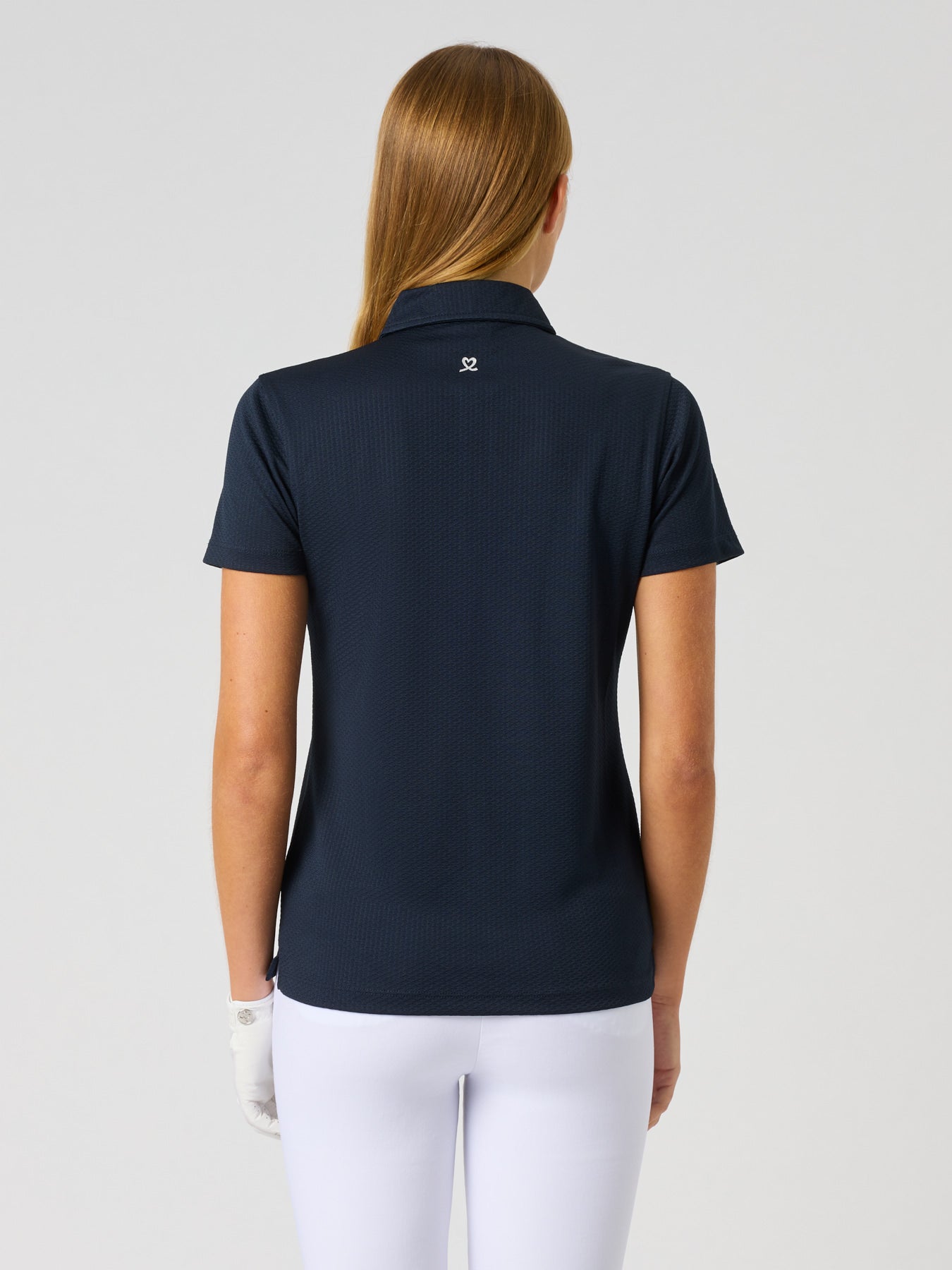Peoria is a fitted golf polo shirt with a neat collar and short sleeves for a sophisticated look. The recycled jacquard knit material gives the top a sporty texture. The fabric also has functional properties that dissipate heat and dry up quickly.