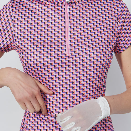 This short-sleeved dress combines a clean, sporty silhouette with functional details. Made from quick-drying fabric for reliable moisture transportation, it features a stand-up collar, half-zip front, and allover print. Two zipped side pockets and detachable inner shorts provide practical comfort on the course.