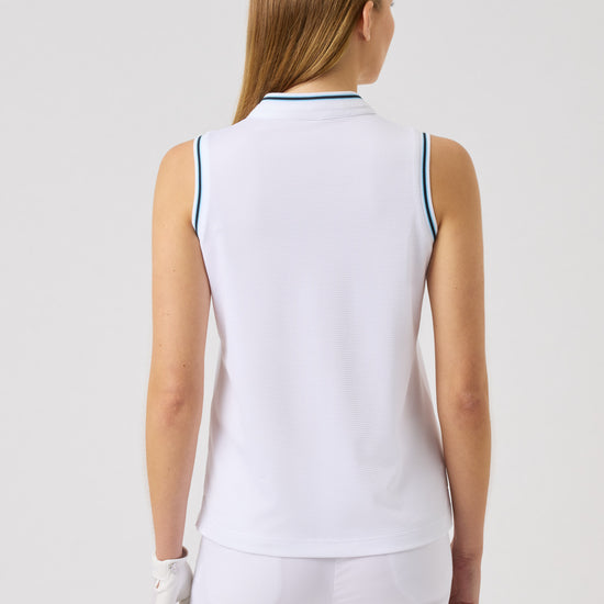 A lightweight sleeveless top in a soft, stretchy dobby jersey that offers quick-drying, moisture-wicking comfort. The contrast rib with subtle stripes around the armholes and placket adds a sporty, modern touch. Designed with small side slits for ease of movement and finished with delicate chest embroidery.