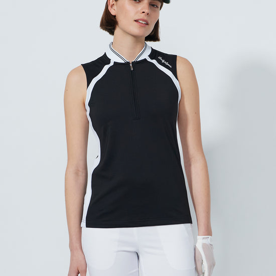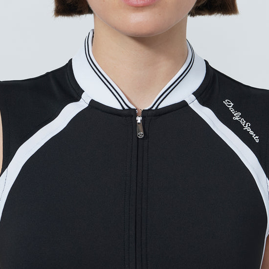 Sleeveless with a striped ribbed collar, this top combines sharp contrast detailing with breathable comfort. The soft and stretchy fabric is quick-drying and moisture-wicking. The short zip front adds functionality to the clean design.