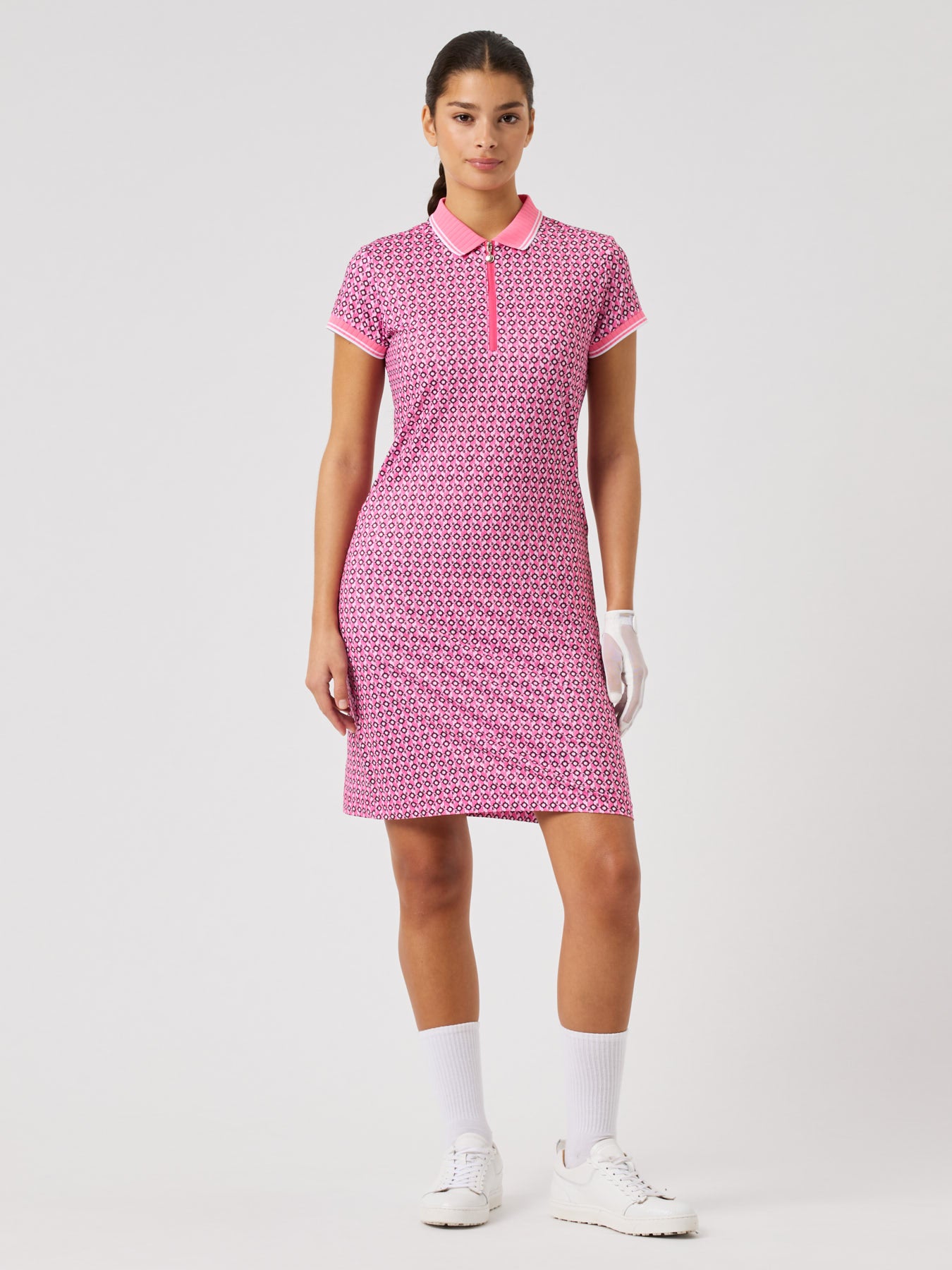 The Sheermotion golf dress is designed for lightweight comfort and breathability. Made from quick-dry fabric, it features a stand-up collar and half zip for adjustable ventilation. The stretchy material provides full mobility, ensuring ease of movement both on and off the course.