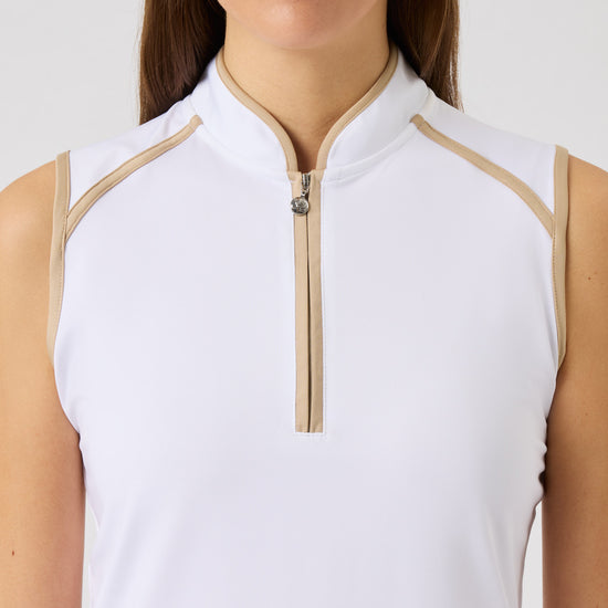 A lightweight sleeveless top made from soft, stretchy fabric with quick-drying, moisture-wicking properties for lasting comfort. Designed with a stand-up collar and a half zip at the front for a sporty, modern look. The contrast jersey at the collar and armholes adds a refined touch that elevates this versatile style.