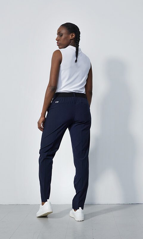Beyond är en sval byxa i ankellång modell med rak passform. Byxan har en dressad look med pressveck, gylf, två sidofickor fram och en ficka med dragkedja bak. Samtidigt är byxan stretchig och har resårlinning bak. Lättviktstyget är gjort av återvunnen polyester och avvisar vind, torkar snabbt och skrynklar inte.